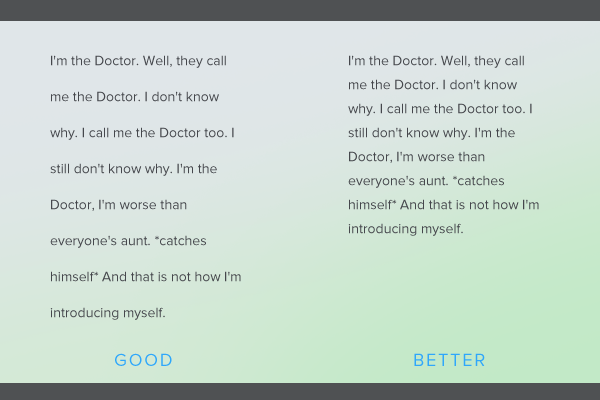 Always keep margins and gutters proportional to the tracking, kerning and leading in a design. If paragraph breaks are roughly the same size as the line height, the paragraphs will look like one giant wall of text. No one enjoys reading walls of text. Visible paragraph breaks will actually make the reader want to read more. Each space will not only allow the eye to rest for a few seconds, it will also give the reader a chance to mentally digest the last paragraph.