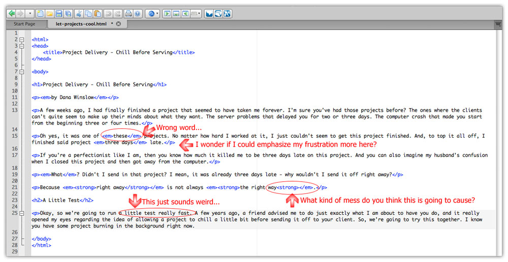 This is why letting your projects chill out for a bit before sending them off to your clients is so important. It gives your superpower of critical sight a chance to charge up. And since you're a professional freelancer, you know that passing your project in front of your worst critic's eyes (that would be you) with charged-up critical sight is the best way of assuring you're delivering a quality project.