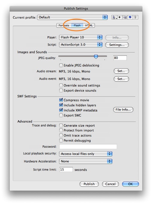 The Publish Settings dialog will open; make sure that the Flash section is selected at the top: