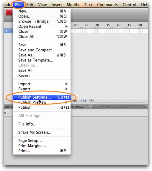 Next, you need to set the Flash Player version. To do this, open the Publish Settings dialog (accessed from the File menu):