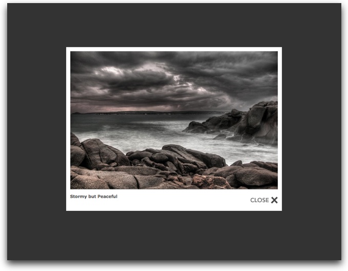 To close the popup, click the darkened area outside the popup, click the Close button or use the Esc key.    If you wish for the user to be able to resume the slideshow, you must include a PlayPauseButton element.    Also note that all images are displayed in the lightbox in isolation (e.g. there are no next/previous buttons).    The lightbox integration is designed to enlarge a single photo, not become an alternate slideshow.