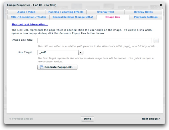 In the Image Properties dialog for the image/slide you wish to use, select the Image Link tab:
