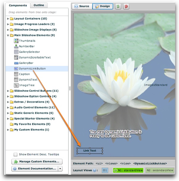 Now, open the wizard and switch to the Layout / Presentation section.    Select the layout view where you want to add the purchase button; this will usually be the same view as that which displays the images.    Drag a new DynamicLinkButton element onto the stage from the Main Slideshow Elements section of the Components Panel: