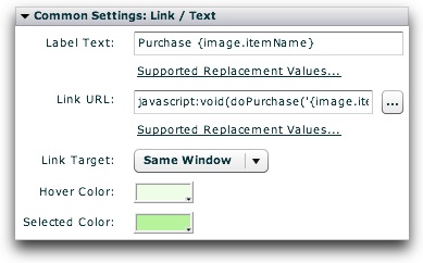 The Label Text is set to be Purchase {image.itemName} .    By using the replacement value, this will make the button display for example 'Purchase Red Toy Car'.    The Link URL is set to:
