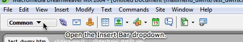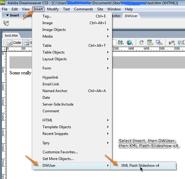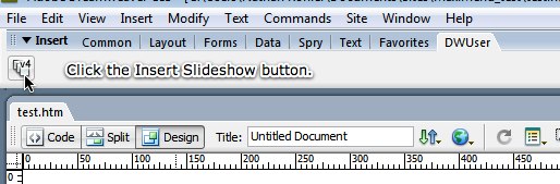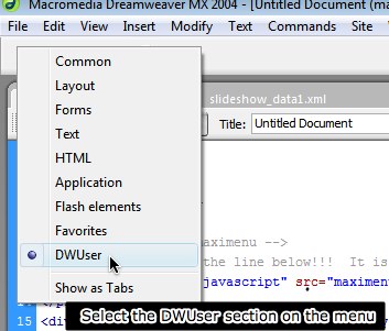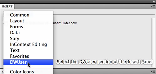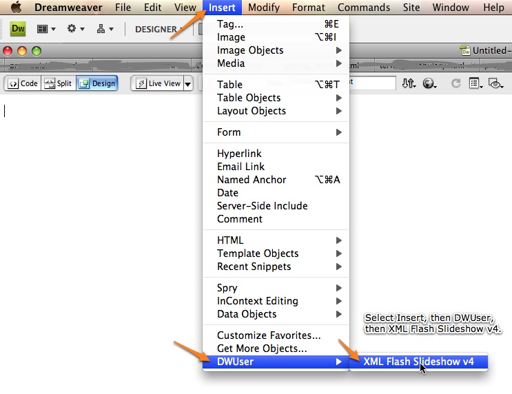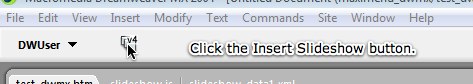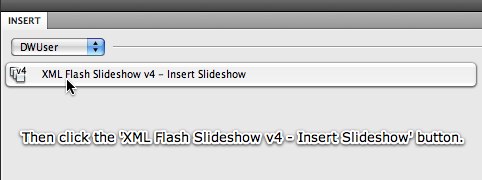 The Insert Slideshow wizard can also be accessed from the Insert Menu, which is the menu at the top of your screen next to File, Edit and View. It is accessed by selecting Insert > DWUser > XML Flash Slideshow v4.