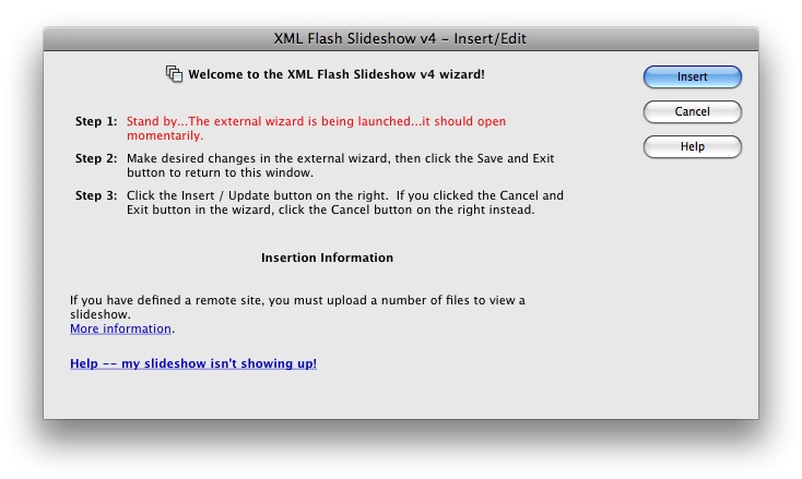 You will return to the Dreamweaver extension window shown above; click the Insert button to actually insert the slideshow into your page: