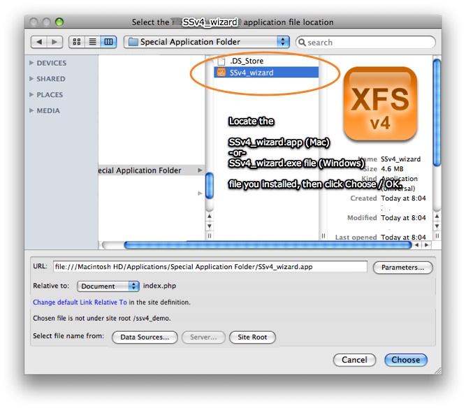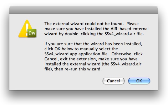 This will happen if you installed the external wizard to a location other than the default, or sometimes if you have a non-standard drive setup (e.g. a separate drive exclusively for applications). When this happens, you must manually locate the wizard once so that the extension knows where to launch it from. Click OK to launch the browse dialog. You will need to know where the external wizard application was installed to. On Windows this will be SSv4_wizard.exe in the Program Files folder, and on Mac it will be SSv4_wizard.app in the Applications folder. Browse to the custom installation location and select the file. The following screenshot is from Macintosh, but the dialog is similar on Windows: