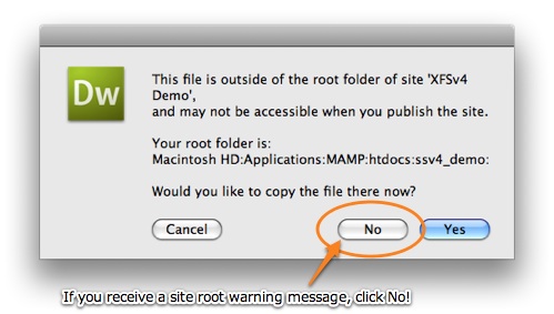 If you receive a 'not in site root' warning, click 'No' (this is important!):