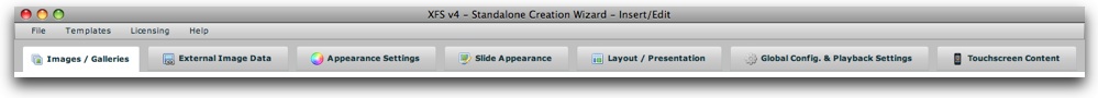 When the wizard first launches, you'll be prompted to either create a blank slideshow or start with a starter template. You will then enter the main wizard interface. All of the main wizard sections are accessed via the tabs at the top of the window: