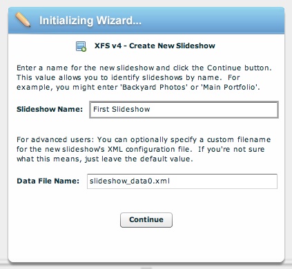 Advanced Users: The Data File Name field specifies the file name which will be used for the new slideshow's XML configuration file. The default value (slideshow_data0.xml, slideshow_data1.xml, slideshow_data2.xml, etc) can generally be used. However, if you're managing a site with many slideshows, it may be helpful to use more meaningful file names.
