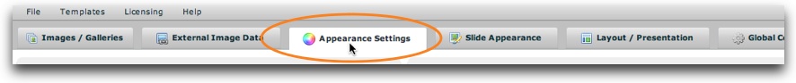 The Appearance Settings section is where you will configure many settings which control the appearance of the overall slideshow. The section appears as follows: