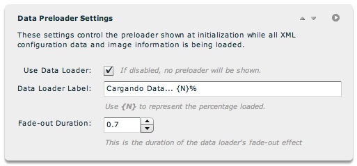 | Fade-out Duration | When data loading completes, the data preloader quickly fades out prior to the slideshow initializing. You can customize the length of this fade-out effect, or essentially disable it by setting it to 0 or 0.1. The value is denominated in seconds. |