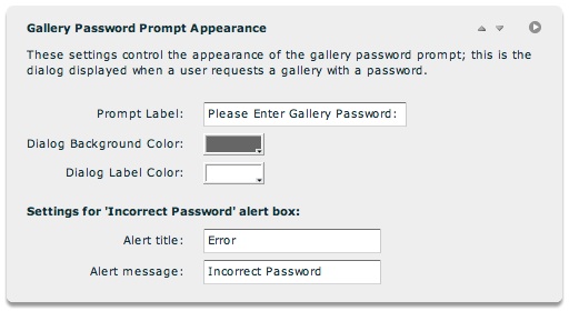 The settings in this pod control the appearance of the gallery password prompt. This is the dialog displayed when a user request a gallery which has been password-protected.