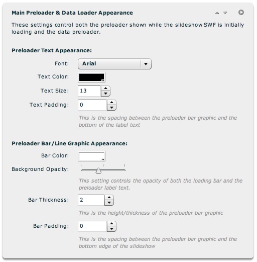 The settings in this pod control the appearance of all preloaders -- both the one shown while the slideshow SWF is initially loading and the data preloader.