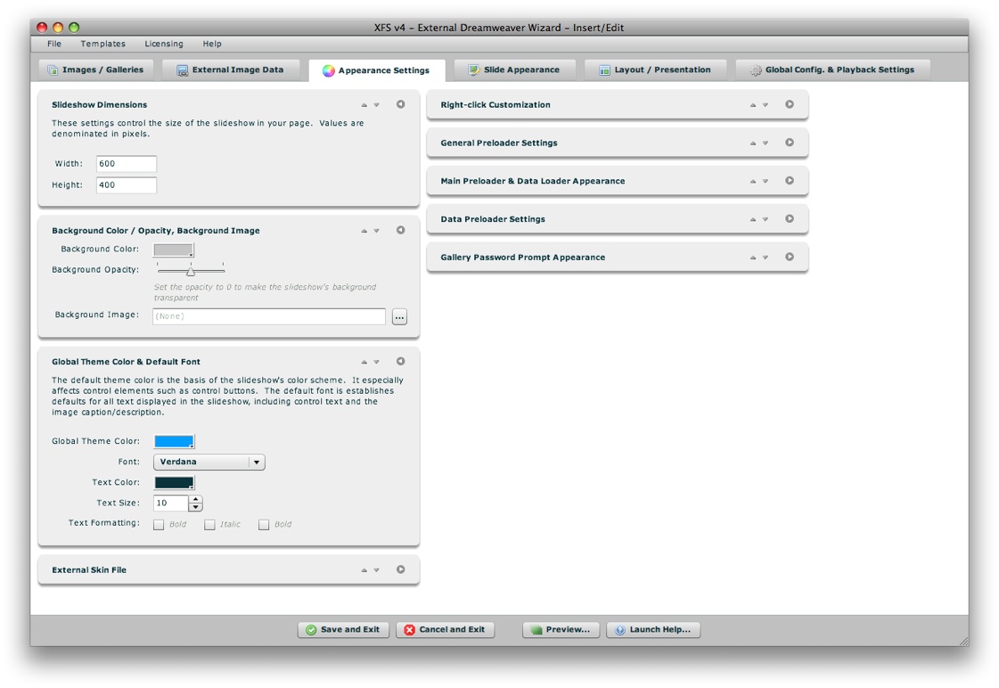 The Appearance Settings panel is made up of a number of collapsible pods. You can expand the pods which are most relevant to you, and re-order them as desired. The order and expanded/collapsed state of the pods is automatically saved, and the last view is restored each time you re-launch the wizard. This is designed to streamline the development process, instantly placing the most relevant and commonly used settings at your fingertips.