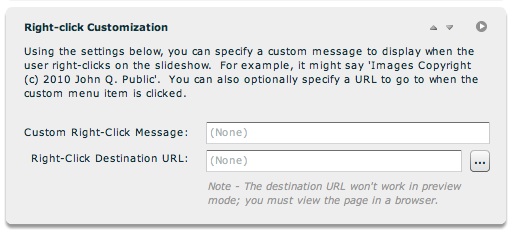 By default, right-clicking on the slideshow only shows 'Settings...' (disabled) and 'About Adobe Flash Player...'. If you prefer, you can customize this menu by adding a custom right click message in the 'Custom Right-Click Message' field. This should be a short string value, such as 'Images Copyright (c) 2010 John Q. Public'. If you specify only a message value, the message will appear disabled in the context menu. If you specify a 'Right-Click Destination URL' as well (e.g. http://www.mysite.com/somepage.html), the message will be enabled and clicking on it will redirect to that URL. Use the browse button on the right ('...') to select a file directly.