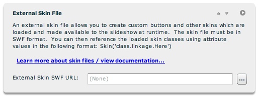 This pod allows you to specify a custom SWF skin file which contains skin assets for the slideshow. These skin files can be used, for example, to customize buttons and other skinnable assets. Icons can be embedded as well. All embedded skin and icon assets which have an export linkage class will then be accessible in the slideshow by using the following format in a Skin or Icon field: