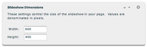 This is where you will specify the dimensions of the slideshow. This is the overall size of the slideshow element in your page. Both values are denominated in pixels. You can also use a percentage value (usually 100%), when creating a full-browser-window slideshow for example.