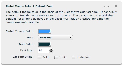 The default theme color is the basis of the slideshow's color scheme. It especially affects control elements, such as control buttons' icon color. The default font establishes defaults for all text displayed in the slideshow, any control text and the image description/caption. The text size is denominated in pixels. The theme color and font settings can be overridden on any specific layout element using the Properties panel.