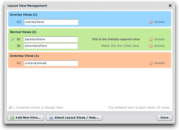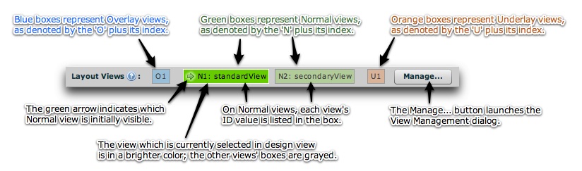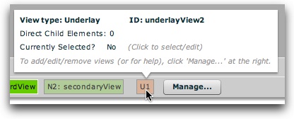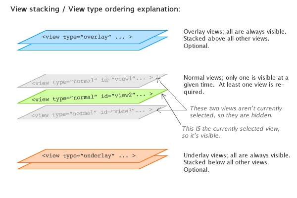 - Underlay Views - Optional; any number can be used. Underlay views are always visible. They are outside of the normal changeable views, resting at the very bottom of the visual stack, always below all the other views. You can have one or more underlay views. They provide a way to display constant background elements which should always be visible, regardless of which normal view is currently visible.