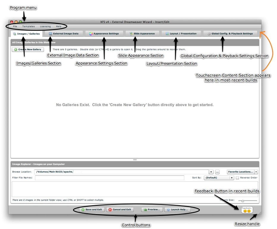 This section provides an overview of the wizard interface, especially general settings and options which are not slideshow-specific.  The image below notes the identification names of the various sections in the wizard window: